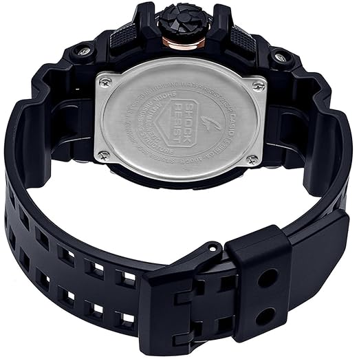 From super-tough G-SHOCK comes a new collection Casio G-Shock GA-400GB-1A4DR, a model known for its bold black and copper-toned (rose gold) aesthetic. It is part of the GA-400 series, which features a prominent rotary switch for intuitive operation. Basic G-SHOCK black is accented in gold to create a HIP-HOP artist or B-BOY fashion item motif. Black with gold, which are employed in a large number of accessories, is used on the case, band, and face, for a boldly cool design. Key Specifications • Design: Features a 51.9mm resin case and bezel with a matching black resin strap. • Display: An analog-digital combination dial with two digital displays and copper-toned accents. • Glass - Mineral Glass • Durability: Built with G-Shock's signature Shock resistance, Magnetic Resistant and is Water-resistant up to 200 meters. • Features: Includes magnetic resistance, LED light -Auto light switch, selectable illumination duration (1.5 seconds or 3 seconds), afterglow, Light colour -LED:Amber.stopwatch, countdown timer, and 5 daily alarms. Accuracy: ±15 seconds per month • World time -World time 31 time zones (48 cities + coordinated universal time), one-touch UTC time zone, daylight saving on/off, Home city/World time city swapping • Stopwatch-1/100-second stopwatch Measuring capacity: 23:59'59.99'' Measuring modes: Elapsed time, split time • Mute feature - Button operation tone on/off • Other features - 12/24-hour format Hand shift feature (Hands move out of the way to provide an unobstructed view of digital display contents.) Regular timekeeping: Analog: 2 hands (hour, minute (hand moves every 20 seconds)), 1 dial (countdown timer minutes) Digital: Hour, minute, second, pm, month, date, day Power supply and battery life Approx. battery life: 3 years on SR927W X 2