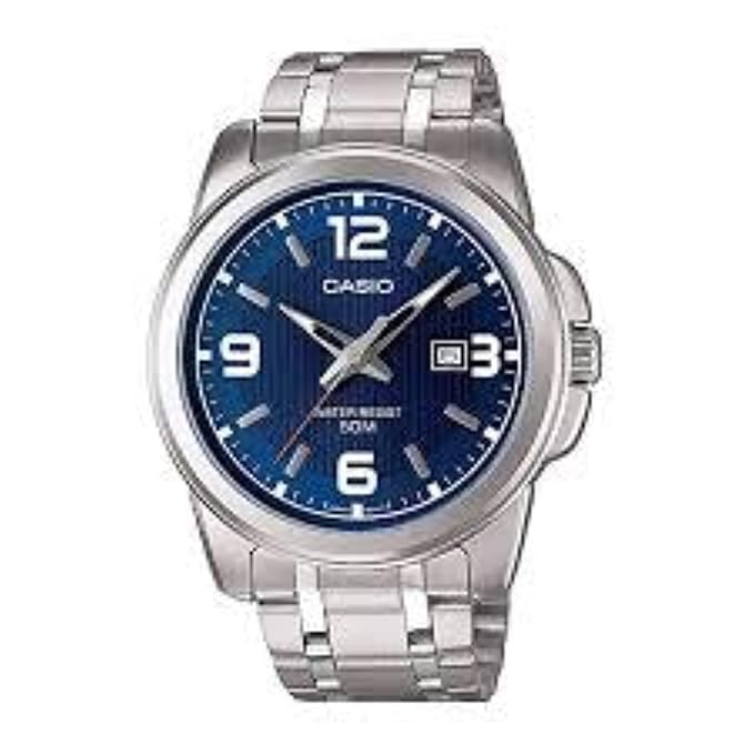 Casio Enticer MTP-1314D-2AVDF, a classic and versatile analog timepiece for men. This specific model is part of Casio's Enticer collection, known for its ""simple, easy-to-use design"". Key Specifications • Design: Features a striking blue sunray dial with large, easy-to-read Arabic numerals at the 12, 3, 6, and 9 o'clock positions. • Build: The watch has a stainless steel band with a triple-fold clasp and an ion-plated case and bezel. • Durability: It is equipped with mineral glass and offers 50-meter water resistance, making it suitable for daily use even in light rain. • Dimensions: The case size is approximately 50 × 44.9 × 9.4 mm, and the total weight is about 126g. • Movement: It uses a reliable Japanese Quartz movement with a regular 3-hand analog display.